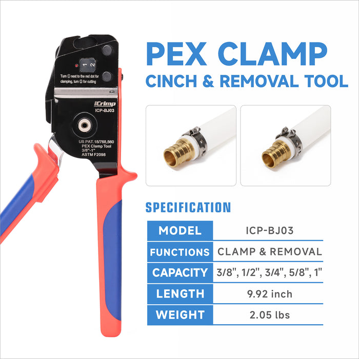 ICP-BJ03 PEX Clamp Tool for Cinch and Removal of 3/8-in, 1/2-in, 3/4-in and 1-in PEX Clamp Rings, One-handed PEX Crimping Tool
