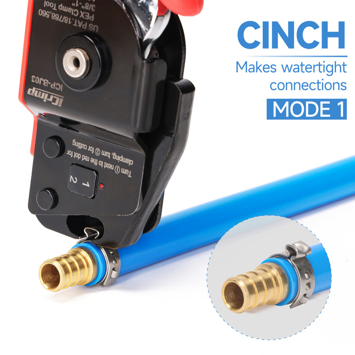 • At mode #1, ICP-BJ03 serves as PEX clamp cinch tool which is capable of connecting 3/8’’, 1/2’’, 3/4’’, 5/8’’ and 1’’ PEX clamp rings onto PEX crimp style barbed fittings. Assuring watertight PEX-b connections